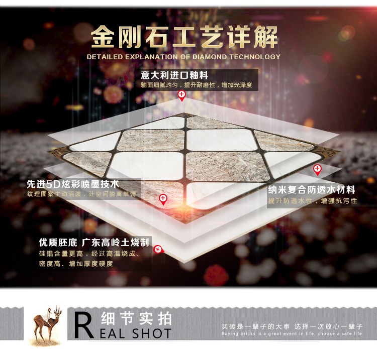 金曼古瓷磚廠家特價金剛石因高品質(zhì)而得名,是一款極具天然石材效果和微晶石質(zhì)感的仿石材瓷磚,它不但在價格、環(huán)保、耐用和清潔上極具優(yōu)勢,在質(zhì)感、規(guī)格、花色、重量等指標上,金剛石都遠遠勝于石材、拋光磚。相比其他種類的產(chǎn)品,它最大的特點可以用“高亮度、高耐磨、高平整、高逼真、高清晰、高環(huán)?!?。