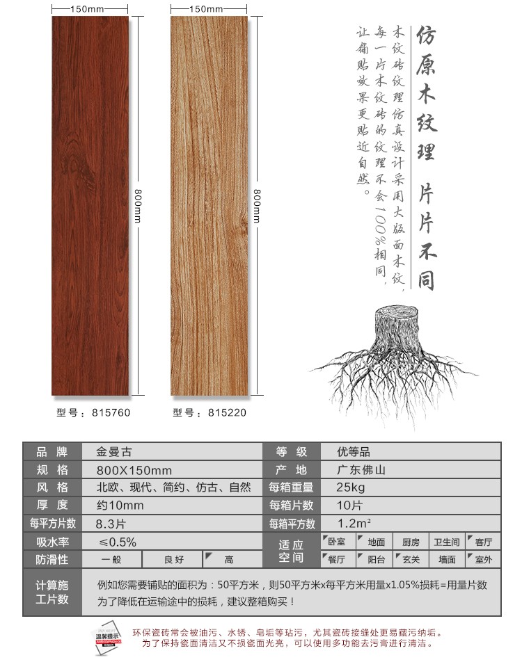 金曼古木紋磚,是一種表面呈現(xiàn)木紋裝飾圖案的環(huán)保建材.紋路逼真、自然樸實(shí)、沒有木地板褪色、不耐磨等缺點(diǎn);曼古陶瓷木紋磚系列線條明快,圖案清晰為特色。本身具有阻燃,不腐蝕的特點(diǎn),綠色、環(huán)保型建材;產(chǎn)品使用壽命長(zhǎng),耐磨,無需像木制產(chǎn)品那樣周期性地打蠟保養(yǎng)等.