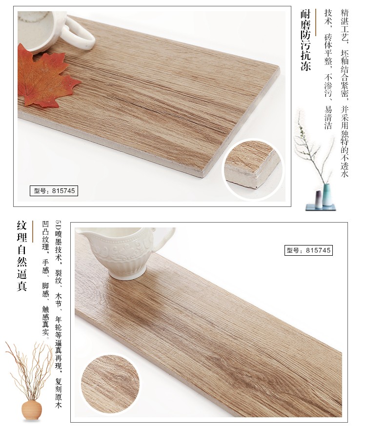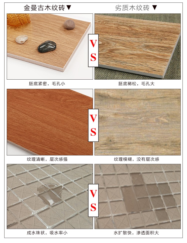 金曼古木紋磚,是一種表面呈現(xiàn)木紋裝飾圖案的環(huán)保建材.紋路逼真、自然樸實(shí)、沒(méi)有木地板褪色、不耐磨等缺點(diǎn);曼古陶瓷木紋磚系列線條明快,圖案清晰為特色。本身具有阻燃,不腐蝕的特點(diǎn),綠色、環(huán)保型建材;產(chǎn)品使用壽命長(zhǎng),耐磨,無(wú)需像木制產(chǎn)品那樣周期性地打蠟保養(yǎng)等.