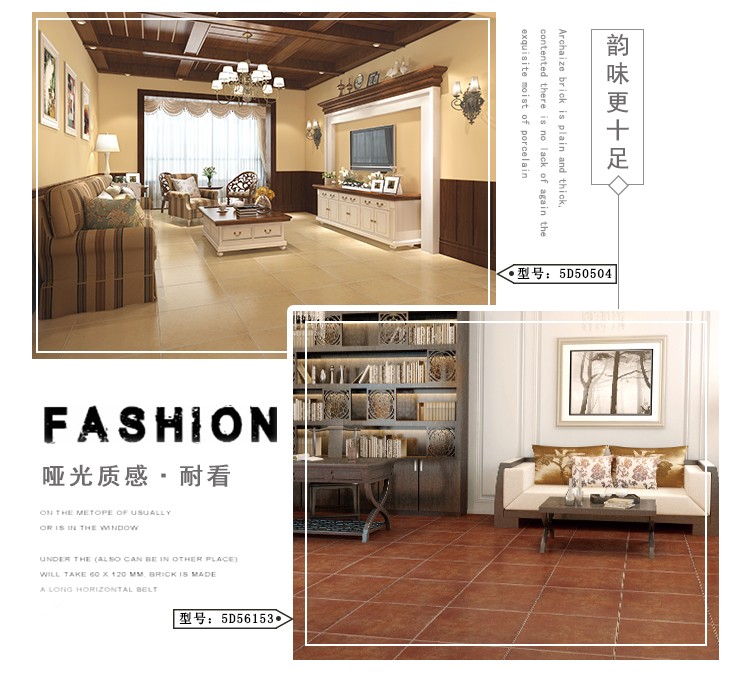 金曼古仿古地磚,采用國際先進的超大型壓機自動成型,經(jīng)世界一流的滾筒印花和高溫煅燒而成,通過仿石、仿巖、仿木、仿布、仿金屬等多種表現(xiàn)方式,產(chǎn)品花色圖案新穎時尚,領(lǐng)先國際潮流,具有超耐磨、防滑、防污等高性能指標。