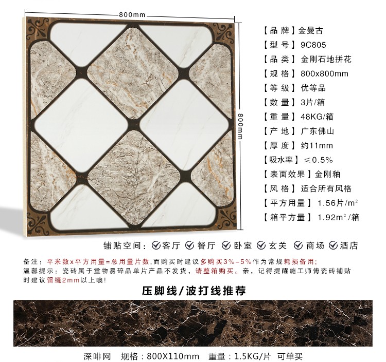 金曼古瓷磚廠家特價金剛石因高品質(zhì)而得名,是一款極具天然石材效果和微晶石質(zhì)感的仿石材瓷磚,它不但在價格、環(huán)保、耐用和清潔上極具優(yōu)勢,在質(zhì)感、規(guī)格、花色、重量等指標上,金剛石都遠遠勝于石材、拋光磚。相比其他種類的產(chǎn)品,它最大的特點可以用“高亮度、高耐磨、高平整、高逼真、高清晰、高環(huán)?!?。